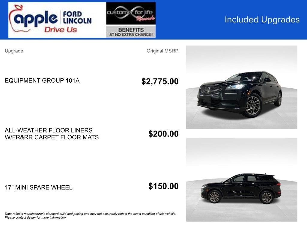*Our Customer for Life Program has stipulations, excludes certain vehicles, uses & equipment. See dealer for details.** Pricing does not include taxes, tags or titling, $300 dealer processing fee [not required by law]. The listed price includes all factory rebates and incentives. Some special APR rates require financing with Lincoln AFS at standard rates. Special APR financing rates are not compatible with all incentives. See dealer for complete details.